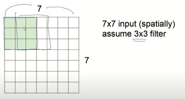 그러므로 7X7의 이미지에 stride가 1인 필터연산을 수행하면 5X5의 output이 나온다는 것이고,